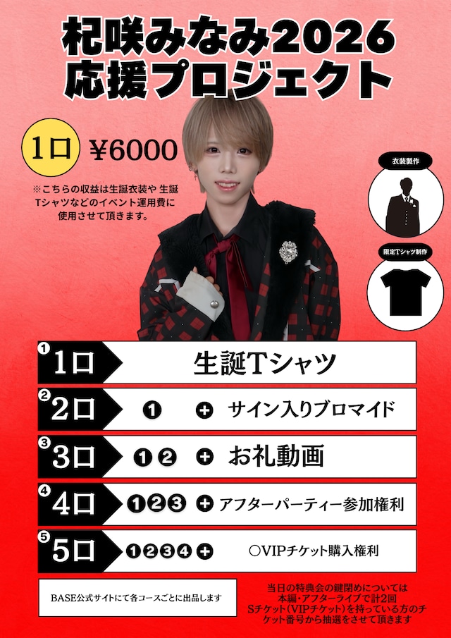 【用途】 ・公演企画費(費用に応じた企画予定) ・制作費、送料 【金額について】 1口6000円とし、購入口数によって内容が変わります。 ・1口(6000円) ◆記念Tシャツ ・2口(12000円) ◆記念Tシャツ ◆サイン入りブロマイド ・3口(18000円) ◆記念Tシャツ ◆サイン入りブロマイド ◆お礼動画 ・4口(24000円) ◆記念Tシャツ ◆サイン入りブロマイド ◆お礼動画 ◆アフターパーティ(集合写真+デジショ付き) ・5口(30000円) ◆記念Tシャツ ◆サイン入りブロマイド ◆お礼動画 ◆アフターパーティ ◆VIPチケット購入権利(VIP限定エリア・撮影可能曲あり) 【今回の公演入場順】 VIPチケット ↓ 一般チケット ↓ 当日入場 【購入方法スケジュール】 ネットショップBASEにて金額ごとに出品します。 公演開催→2026年1月18日(日)『杞咲みなみ生誕祭2026』